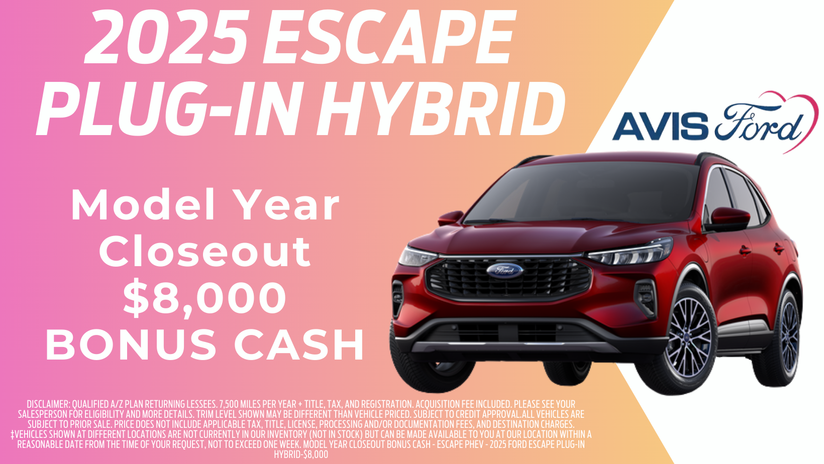 Model Year Closeout 2025 Ford Escape® Plug-In Hybrid Take advantage of incredible savings during our year-end event. $8,000 BONUS CASH